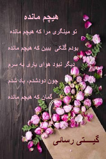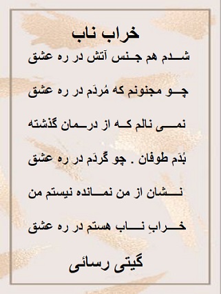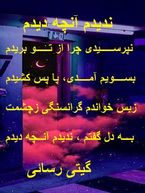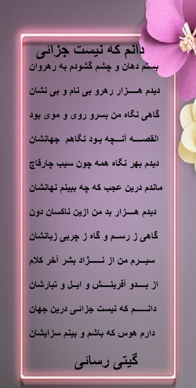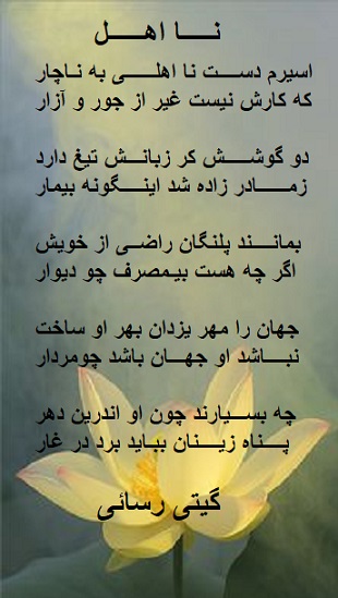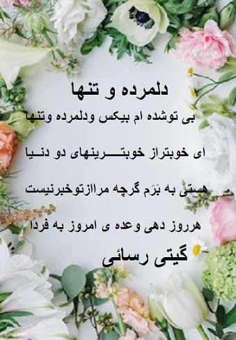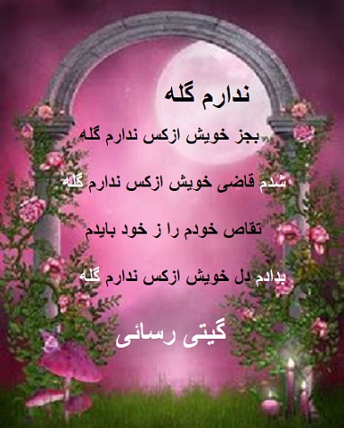 زنی ایرانی هستم . با نام ایرانی گیتی . ادعای شاعری ندارم از هیچ قالب شعری پیروی نمیکنم نوشته هایم را به دلخواه و برای دلم مینویسم نه قافیه و نه ردیف و نه......... هیچکدام مورد نظرم نیست