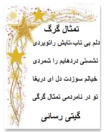 زنی ایرانی هستم . با نام ایرانی گیتی . ادعای شاعری ندارم از هیچ قالب شعری پیروی نمیکنم نوشته هایم را به دلخواه و برای دلم مینویسم نه قافیه و نه ردیف و نه......... هیچکدام مورد نظرم نیست